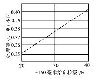 為使自磨機(jī)效率高工作,給礦中各粒級保持適當(dāng)配比是重要的。某燒結(jié)總廠對給料中大小粒級配比的試驗結(jié)果列于表1。從表中可以看出,給料+300毫米粒級與-300毫米粒級各占50%時,其產(chǎn)量更高,磨碎效果更好。其產(chǎn)量與全部是粗粒級或全部是細(xì)粒級比較,分別提高30.6%和50.5%。又如北美的皮坎茲_瑪瑟公司(PickandsMather&Co)試驗了原礦中含不同比例)+150毫米粒級的物料對自磨的影響,如圖3-3-10所示。從圖中可看出,給礦中+150毫米粒級的物料產(chǎn)率減少,自磨機(jī)的處理能力也隨之降低。為此,認(rèn)為首段自磨機(jī)的給礦粒度組成應(yīng)保持在+150毫米占40%,-150+75毫米占20%和-75毫米占40%。因而,必須采取配礦措施以保持給入自磨機(jī)的原礦粒度特性合適。