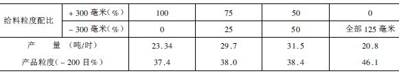 表1給料粒度配比對自磨機(jī)產(chǎn)量、產(chǎn)品粒度的影響
