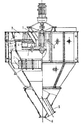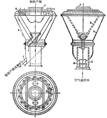 通過(guò)式離心分級(jí)器(見(jiàn)圖3),主要用于與干式磨機(jī)閉路工作。設(shè)備主要由外錐1和內(nèi)錐2組成,上部裝有導(dǎo)向葉片5,使由內(nèi)外錐之間上來(lái)的氣流呈切線進(jìn)入內(nèi)錐。磨機(jī)產(chǎn)物與氣流一起從底部管道中以大約18~20米/秒的速度向上供入,進(jìn)入內(nèi)外錐之間的環(huán)形空間后,因過(guò)流斷面變大,速度降至4~6米/秒,于是,粗的礦粒落下,由管4中排出,返回磨機(jī)再磨。其他礦粒被氣流帶著往上行,經(jīng)葉片5,呈切線進(jìn)入內(nèi)錐,產(chǎn)生回旋運(yùn)動(dòng)。在慣性離心力作用下,較粗的礦粒被拋到內(nèi)錐壁上,然后下落,由排礦管6排出。這種產(chǎn)物或作為產(chǎn)品,或者返回磨機(jī),視情況而定。細(xì)礦粒隨氣流從頂部管道中排出,至集塵器中收集,為細(xì)粒產(chǎn)物。