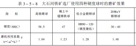A.B.基爾波申(KH)在研究鋼球硬度對(duì)磨礦指標(biāo)的影響時(shí)指出,實(shí)驗(yàn)室試驗(yàn)證明,鋼球?qū)Ω鞣N類型的礦石都存在一個(gè)更佳硬度的問題。按此說法,各種礦石的硬度更好值均不相同。這個(gè)說法是有道理的,值得進(jìn)一步研究。我國首鋼大石河鐵礦的生產(chǎn)應(yīng)用有力說明這個(gè)問題。大石河鐵礦1981~1983年使用了+ 種不同硬度的鋼球,各種球磨礦時(shí)的磨機(jī)利用系數(shù)如表3-5-8所示。
