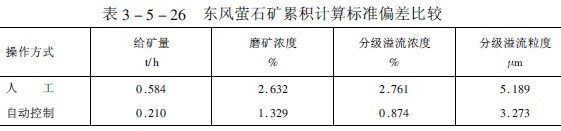 我國(guó)東風(fēng)螢石公司浮選廠(chǎng)和首鋼大石河選礦廠(chǎng)磨礦分級(jí)自動(dòng)控制經(jīng)驗(yàn)表明,采用自動(dòng)控制系統(tǒng)時(shí),磨礦操作的各項(xiàng)指標(biāo)的波動(dòng)范圍均比人工操作小(見(jiàn)表3-5-25和表3-5-26)。