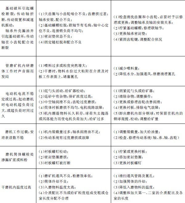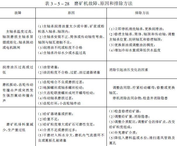 我國(guó)選礦廠(chǎng)生產(chǎn)實(shí)踐中球磨機(jī)易損件的材質(zhì)、使用壽命和設(shè)備用量列入表3-5-27中。常見(jiàn)故障、原因和排除方法見(jiàn)表3-5-28。