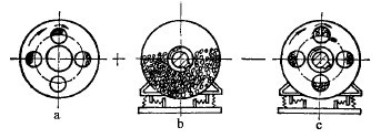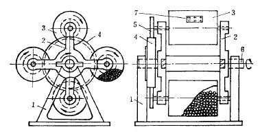 圖2示出了回轉磨機的結構及工作原理。當轉動軸6旋轉時,筒體1除在水平方面旋轉外還圍繞2在垂直方向旋轉,這樣促使研磨介質作非常復雜的運動。筒體在垂直方向和水平方向適宜的速比為1:1~1:1.5。