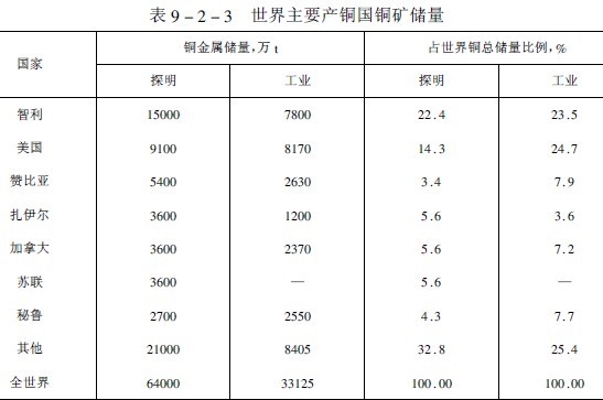 近年來,世界各地陸續(xù)發(fā)現(xiàn)和開發(fā)了一些新的礦床,擴(kuò)大了一些老礦床和利用了一些低晶位銅礦,世界銅礦儲量有所增長。據(jù)美國礦山局1981年礦產(chǎn)要覽所載,世界已探明的銅金屬量為6.4億噸,其中正在開采的礦山儲量為3億噸,正在建設(shè)的礦山儲量為5850萬噸。銅礦主要集中在智利、美國、贊比亞、蘇聯(lián)和秘魯?shù)葒?。智利、美國和贊比亞三國銅儲量約占世界總儲量的一半。世界銅礦儲量列于表9-2-3。