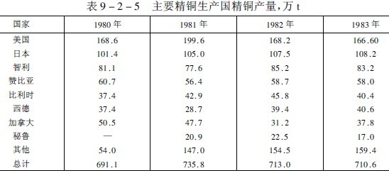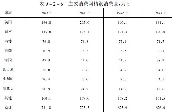 1983年,資本主義各國精銅消費量達(dá)680萬噸左右,與1982年的消費量相當(dāng)(表9-2-6),其中美國增長15萬噸(9%),英國增長0.9萬噸(2.5%);加拿大增長3.7萬噸(25%)。其他各主要發(fā)達(dá)國家精銅的消費量普遍下降。