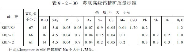 表9-2-29及表9-2-30為蘇聯(lián)國家鎢精礦產(chǎn)品標準,表9-1-31為國外質(zhì)優(yōu)鎢精礦產(chǎn)品標準。