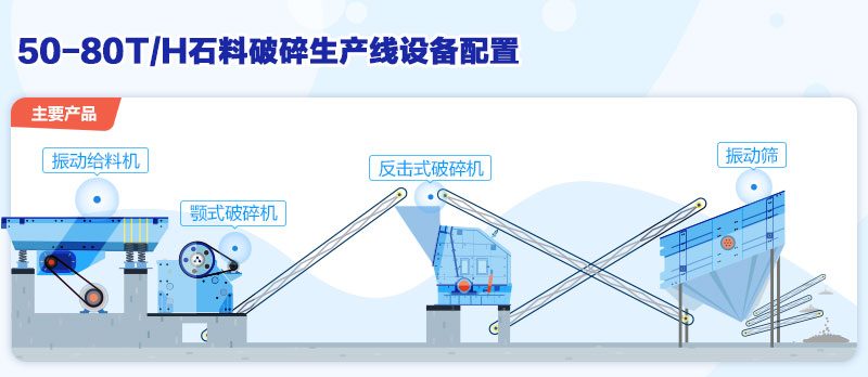 在石料的破碎生產(chǎn)中破碎機(jī)、篩分機(jī)、給料機(jī)、輸送機(jī)是不可少的,其中50-80T/H石料生產(chǎn)線配置的設(shè)備有振動(dòng)給料機(jī)、顎式破碎機(jī)、反擊式破碎機(jī)、振動(dòng)篩、皮帶輸送機(jī),關(guān)于設(shè)備的型號(hào)、參數(shù)、優(yōu)勢等請(qǐng)看下文。